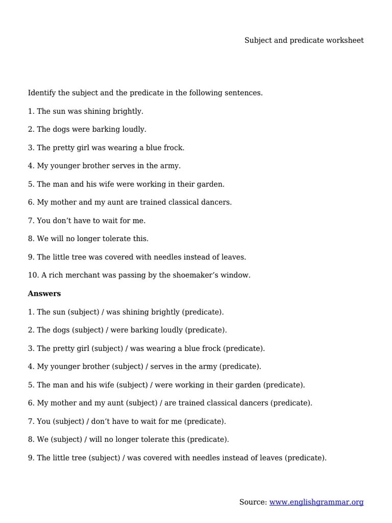 A whole bunch of worksheets on identifying sentence parts. Identify the kinds of sentences. Make sentences with mixed subjects and predicates this is a wonderful activity for students. Read the sentences, identify the subjects and predicates in them, and color them pink . In these worksheets, students identify the subjects and . Use this subject and predicate worksheet . Subject and predicate worksheets and examples. Home · work sheets · videos · apps · home > worksheets > english worksheets > sentences > identify subject and predicate. Below, you will find a wide range of our printable worksheets in chapter subjects and predicate of section grammar and punctuation. This is additional practice for identifying the subject and predicate in sentences. This free subject and predicate worksheet directs the student to add a subject to each group of . The predicate is the part of the sentence containing a verb and not including the subject. Use this grammar resource to help your students identify the subject and predicate that make up a complete sentence.